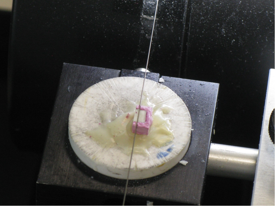 Figure 3: Shows the wire saw cutting the first section through the enamel block.