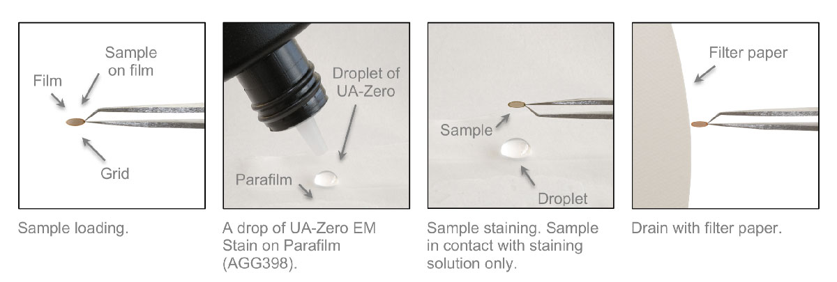 Staining the sample on a TEM grid with a support film requires just a few simple steps before drying, shown in the images below: