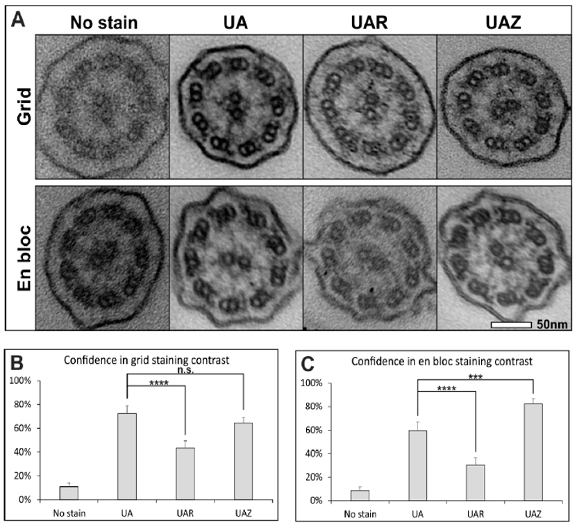 "Anonymised images were compared by 10 electron microscopy specialists and scored based on the confidence they had in the staining. When staining sections on TEM grids, UA and UAZ gave the greater confidence in staining compared to UAR. No significant difference in confidence in staining was observed between UA and UAZ. UAZ en bloc provided staining with the highest confidence results." Read the full paper here.