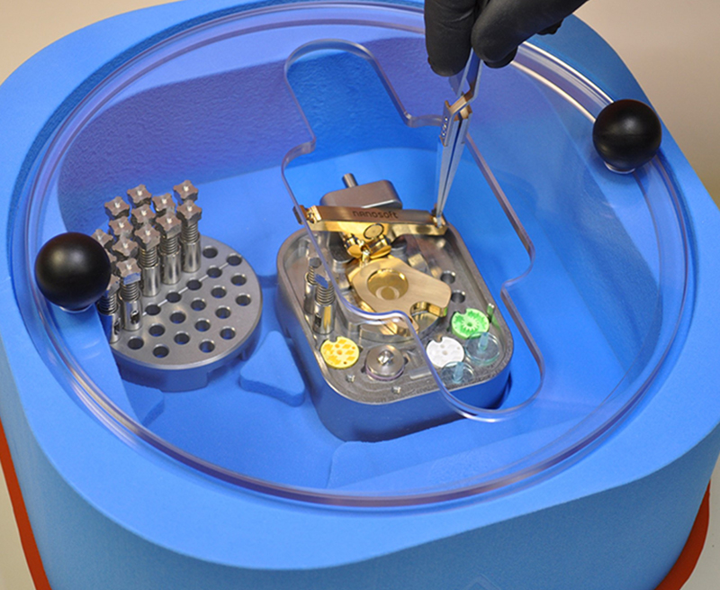 The station comes with a puck-sized holder for up to 33 tools that can be pre-loaded with C-Clips and placed in the holder to be cooled down while being held reliably in place. The puck and tools are in a position that is easy to access and enables seamless clipping of up to 33 samples at one time with one puck-full of tools.