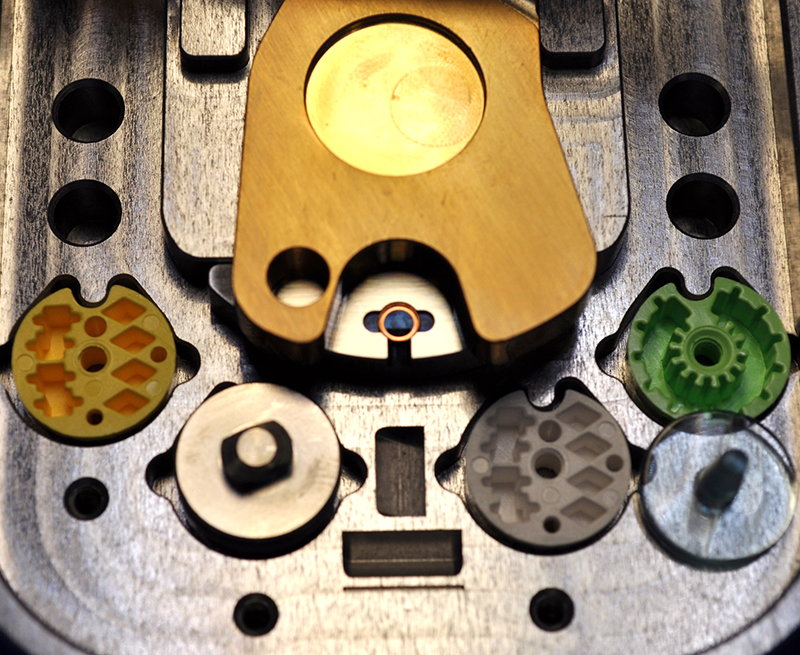 The Hub has 4 'on-deck' positions for clipping tools where they can quickly be accessed for rapid-fire clipping. The shallow hole where the autogrid ring is placed for clipping has a dark-coloured surface to provide better contrast and easier tracking for placement of the autogrid ring and picking up of the clipped grid with autogrid tweezers.