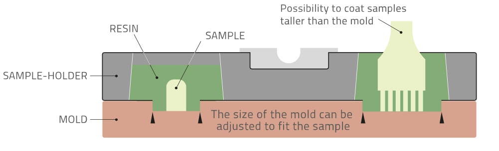 This system has two removable parts: the metallic universal sample-holder with non-stick coating and a special silicon-based flexible mould to embed cold mounting samples.