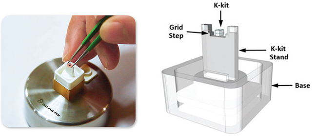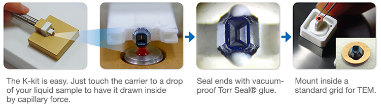 The K-kit is an easy-to-use, innovative sample holder for liquid specimens. It is a single-use sample holder with a sealable micro-channel between two silicon nitride membranes. Manufactured from silicon with Si3N4 membranes, the K-kit is compatible with most standard TEM holders.